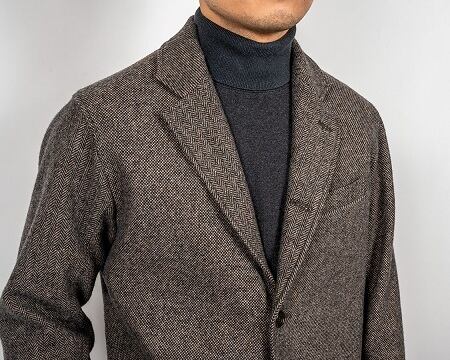 ラペルは細すぎず、太すぎないデザインで胸は箱ポケットを左側に配置。両側フラップポケットで、クラシックな佇まいとなっています。