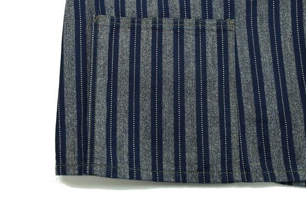 素材にはインディゴツイル地に杢ストライプの抜染プリントを施した、オリジナルの杢ウォバッシュ地を使用。