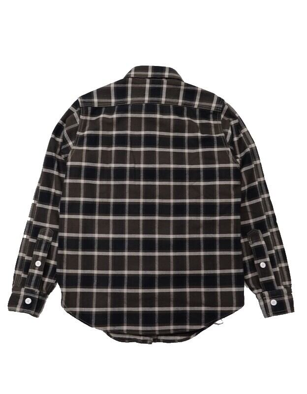 ブラウン系のカーキに、ブラック、クリームが混ざり合う絶妙な色合いのネルチェックシャツ。