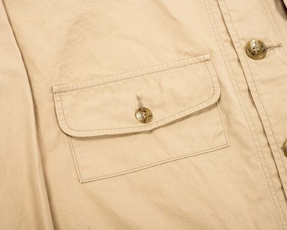 身頃パターンは同ブランドのファティーグジャケットを参考に、ポケットなどの形状や配置を見なおし、素材はコットン100%の高密度ポプリンを使用して、5,7oz程度。