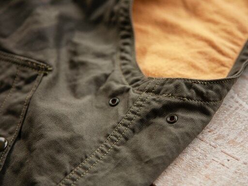 少しトーンを抑えた暗めのオリーブに、ステンシルのブラックが落ち着いた雰囲気のカスタムで非常に格好良く、デッキジャケットの雰囲気がうまくベストに落とし込まれた同ブランドらしいアレンジを効かせたベストになっています。