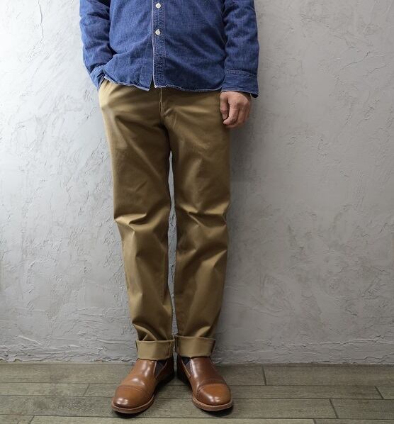 素材にはコットン100%の10,5ozチノクロスを使用。ワーカーズで別注で製作されたUSMCカーキをご提案します。