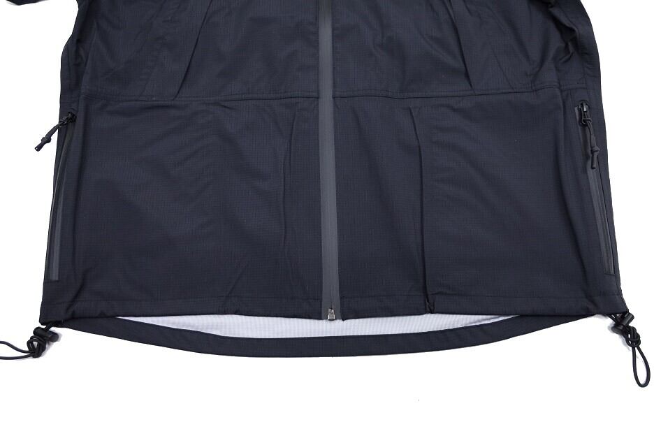 フード口、裾にはコードロックが設けられ、必要に応じて絞って調整可能です。