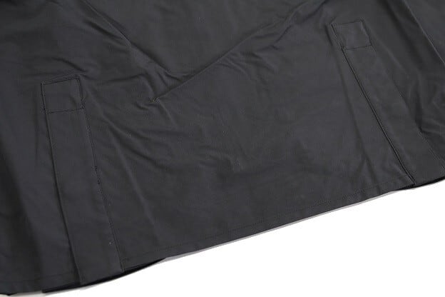 比翼部分、裾ポケットのフラップ部分、そして背面のサイドベントには
