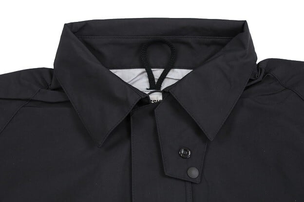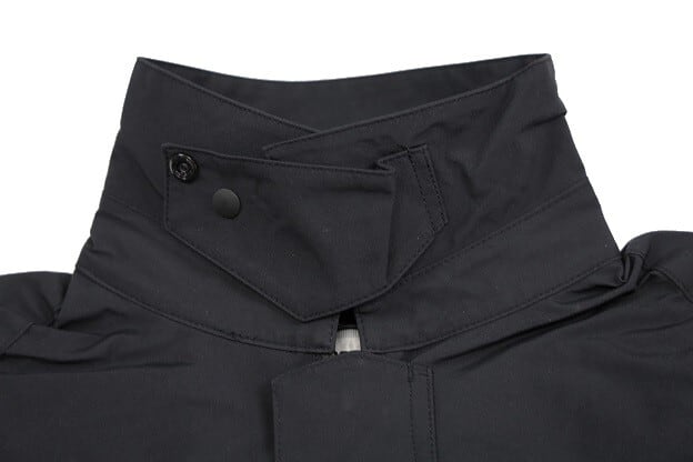 スタイルはハーフ丈のコートスタイルとなっており、襟はストラップによりスタンドカラーとしても着用可能。