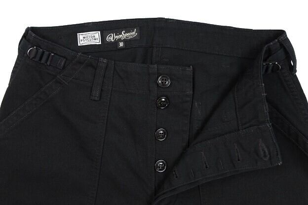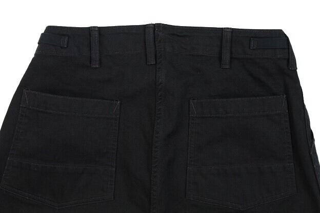 フロントは19mmの尿素ボタンを使用したボタンフライとなっており、ウエストにはハシゴバックルを設け