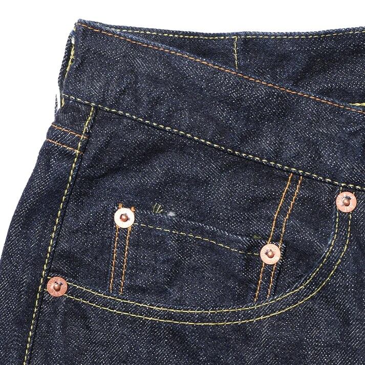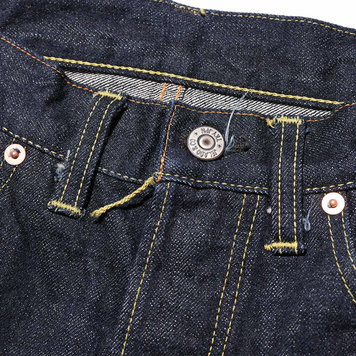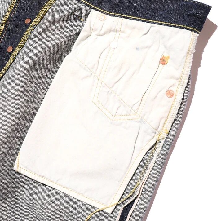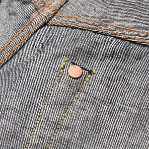 ボタンは鉄製にメッキをかけたオリジナルボタンを使用。 片面レーヨンタブ、銅ずくのオリジナルリベット
