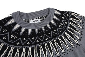 特徴ある襟周り、袖、裾に入る柄はモデル名【Trondheim トロンハイム】よりノルディック柄を意識した所謂雪柄となり、配色や柄の配置などはヴィンテージの雪柄を組み合わせたオリジナルのデザインとなっています。また、サーモライトのポリエステル糸を使用する事で