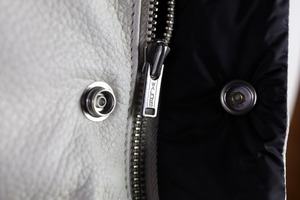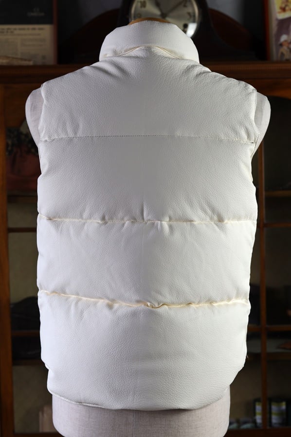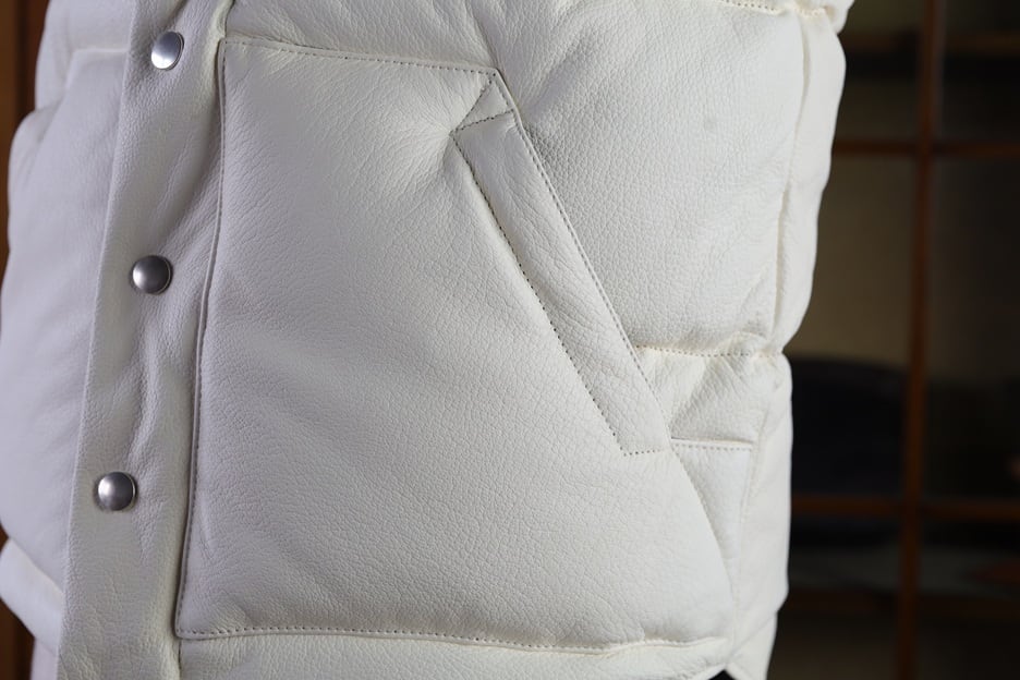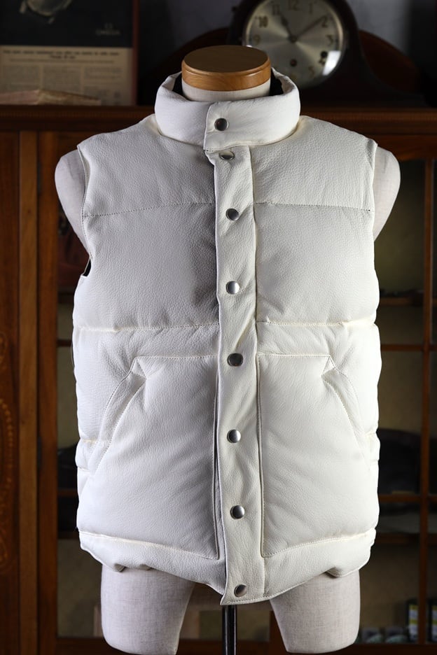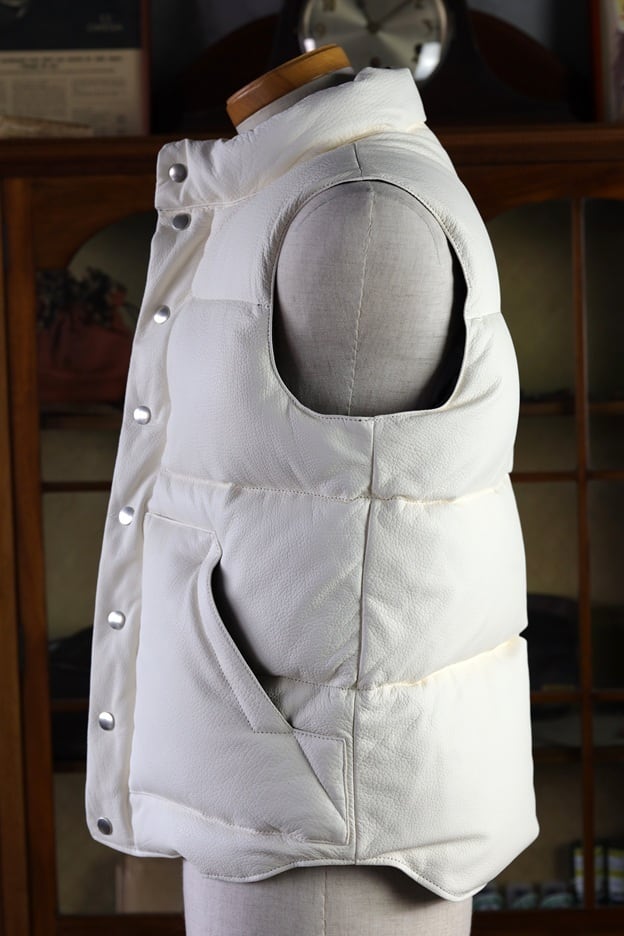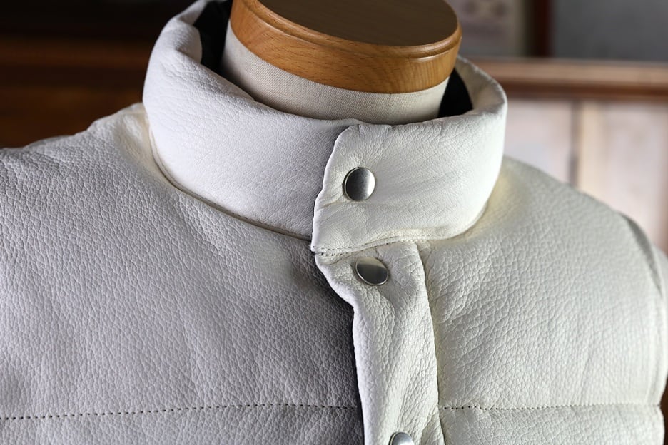 レザーを用いたダウンで多く見られる、表革の圧によりダウンがつぶれてしまうような事はなく、しなやかなディアスキンを用いる事でより柔軟なシェルにし、ダウン本来の性能を発揮するとともにレザーベストと思えないような軽量でとても着やすいダウンベストに仕上げられています。