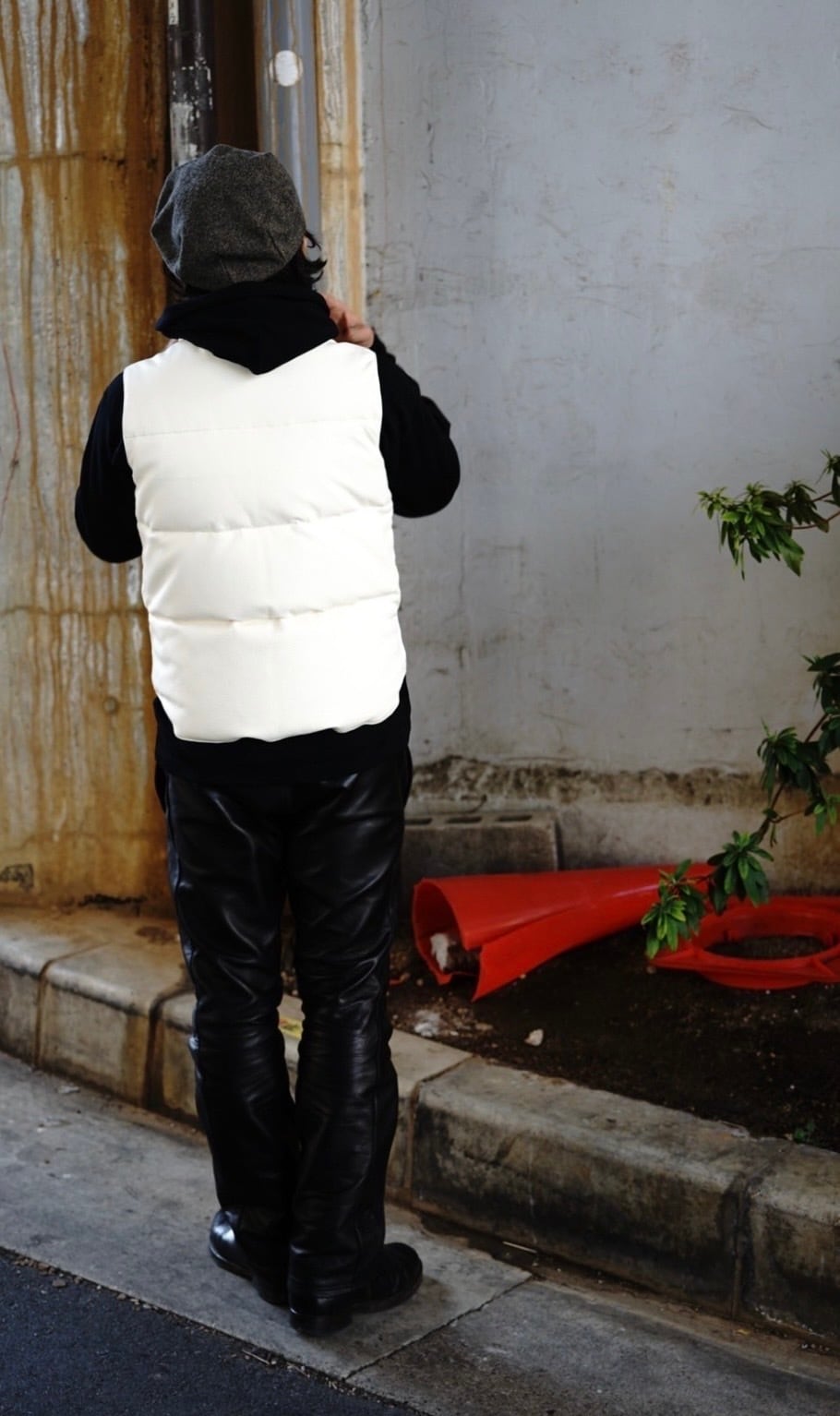 アウトドアブランドでも見られる、スタンドカラーでウエストにポケットを用いたシンプルなデザインにダウン90,フェザー10で730フィルパワーの性能を誇るレザーベスト。