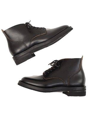 素材にはイタリアンホースバットを使用しており、薄く顔料をのせた厚みのあるホースバットは特有のクリアな光沢感に加えて、履きこむほどに現れる茶芯の表情が