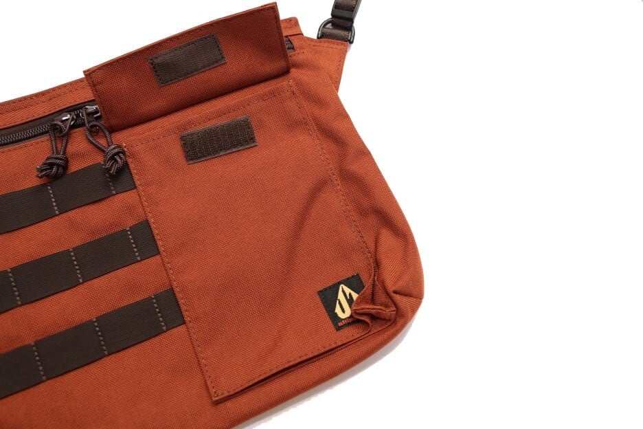 ボディ外側にはスマートフォンが収納できるくらいのフラップポケットが付き、こちらはベルクロでフラップの開閉が可能。