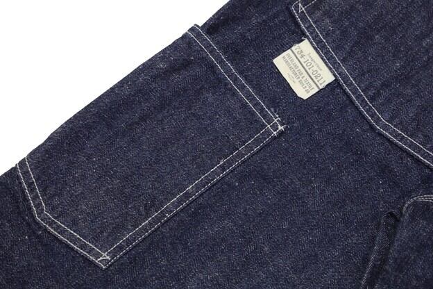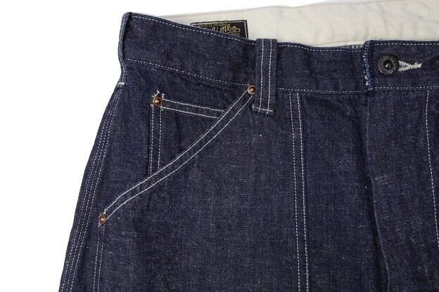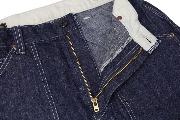 フロントはジッパーフライにより、TALON刻印のジップを採用。トップボタンはコリンボオリジナルタックボタンを使用しています。また各所にブラス製UFOリベットが施されており