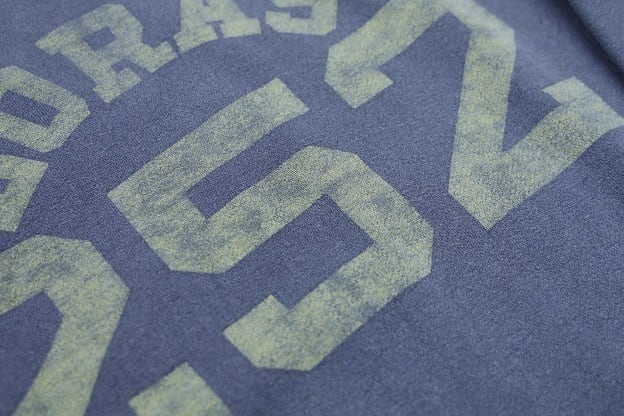 通常の加工では再現が難しい、プリントの剥がれやヤケ感などがヴィンテージスウェットを思わせる非常に魅力ある雰囲気。ここから更に着込む事で表情の変化を楽しんで頂けます。